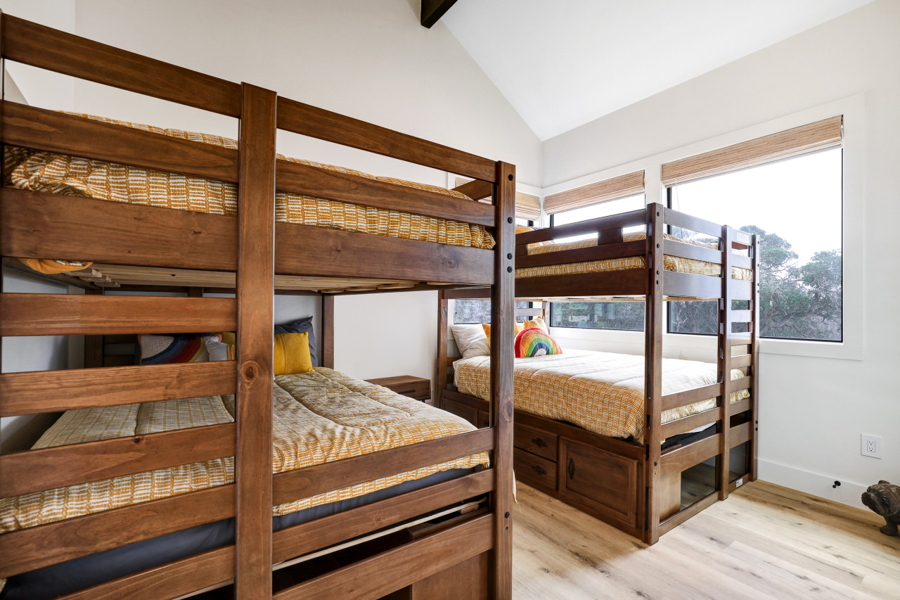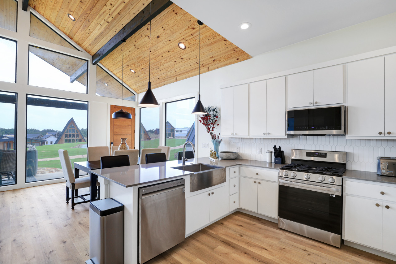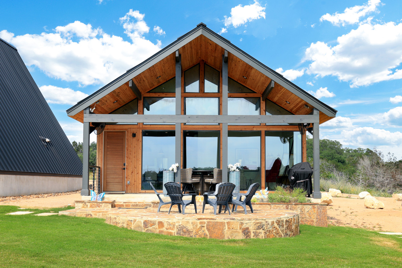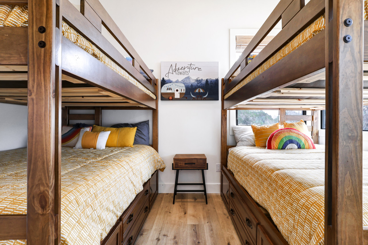 Welcome to our beautiful, newly built Private, Waterfront Escape located at Gruene Lake Ranch! Enjoy our spacious, 3-bedroom, 2-bathroom open floor plan. This cabin is perfect to accommodate family & friends for a private getaway or long-term stay. San Antonio & Austin Airports are both about an hour drive from the cabin. Enjoy local tourist spots such as Whitewater Amphitheater, Schliterban, Canyon Lake, Wurstfest, & Downtown Gruene all within 15 minutes of the property! This upscale, spacious cabin can accommodate up to 6 guests comfortably and is located in the upper lake area. This home comes equipped with everything you need, including; ceiling fans, window coverings, and a full size washer and dryer for your convenience. Bedroom 1: King size bed with an en–suite walk in shower bathroom. Bedroom 2: Queen size bed. Bedroom 3: Two Full Bunk Beds (4Bd's). Guest Bathroom: Shower/tub combo perfect to bathe the little ones. Living Space & Dining: Enjoy our floor to ceiling windows with a beautiful view of our community pond and walking trail. This cabin does have a dedicated workspace area for your convenience. Enjoy our bar cart equipped with a pitcher to make some fresh margaritas or sangria. The living room comes equipped with a large smart tv and seating for up to 6 guests. The dining room has a large dining table for up to 6 guests along with 2 additional barstools for the bartop. Kitchen: Our Kitchen is fully furnished with a gas stove top, pots & pans, baking sheets, blender, drip coffee maker, toaster, and all basic cooking utensils. Exterior areas: The cabin is located directly in front of a pond surrounded by a walking trail. Enjoy our private bonfire area with seating for up to 4. Located just outside the cabin is a private dining area with seating for up to 6 guests. Guests may enjoy feeding and visiting our very own Gruene Lake Ranch cattle. COMING SOON: This summer guest can enjoy the resort amenities such as the pool, restaurant, bar, event center & so much more! Parking: Located behind the back of the cabin. This is gravel parking. Construction: Guest access is currently limited throughout the resort as it is still under construction. Additional Information: -Uber/Lyft is Available -We do offer cleaning services during your stay for an additional cost. -We do not provide the wood for the fire pit, but it is readily available at nearby grocery stores and gas stations. -Resort amenities will be available Late 2026. Please confirm before booking if amenities will be available during your stay. -There will be active construction during your stay as the resort is being completed. This may cause noise during the day. Please avoid the construction areas. This Cabin is located in the Texas Hill Country area. That being said, guests may encounter wildlife throughout the community. We do not perform preventive pest control so guests may encounter several types of insects, bugs etc.. To help minimize any issues with pest, guest must help with keeping the doors closed at all times, disposing of food property, and cleaning up after themselves during their stay. We do not provide any refunds due to any pest or wildlife issues. Nearby Activities: Whitewater Amphitheater - 3.7 Miles Gruene Hall - 7 Miles Heb Plus - 8.2 Miles Buc-ee’s - 8.2 Miles Wurstfest - 10 Miles Schlitterbahn - 10.2 Miles San Marcos Outlets - 15 Miles Canyon Lake - 16 Miles River Walk - 42 miles San Antonio Airport - 43 Miles Downtown Austin - 50 Miles Austin Airport - 50 Miles